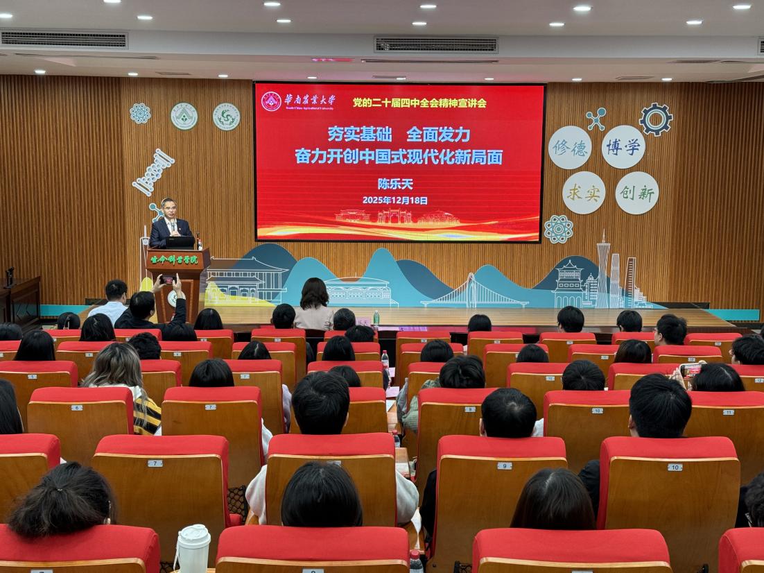为推动党的二十届四中全会精神在基层学院落地生根,切实把师生思想和行动统一到党中央关于“十五五”时期的战略部署上来,12月18日上午,校党委常委、副校长陈乐天在生命科学学院119报告厅为我院遗传学教工党支部、研究生第一党支部全体党员讲授专题党课,并开展党建工作督导。学院党委书记吕剑红参加活动。陈乐天围绕党的二十届四中全会的历史方位、核心要义与实践要求,进行了系统阐释和深入解读。在核心精神解读环节,重点围绕“十四五”时期取得的历史性成就、“十五五”时期指导原则与发展目标、重点战略任务部署三大板块展开。他指出,“十四五”时期我国经济实力、科技实力、综合国力跃上新台阶,中国式现代化迈出坚实步伐,为新征