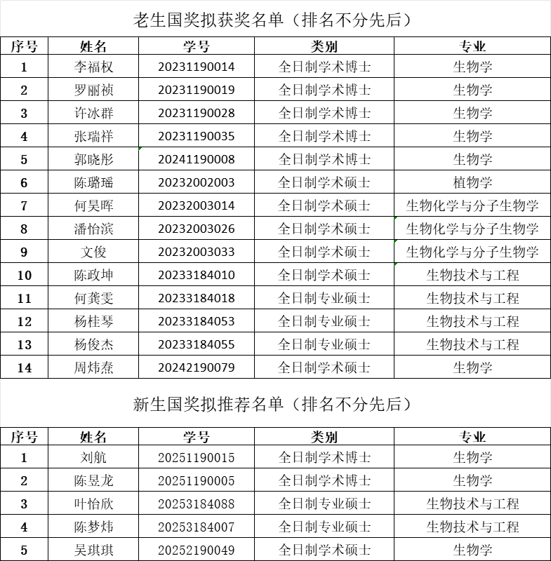 根据《关于开展我校2025年研究生国家奖学金评选工作的通知》精神,以及《华南农业大学研究生国家奖助学金实施办法》等相关规定,经研究生自主申请,学院研究生国家奖学金评审委员会对申报材料进行严格审核、组织公开答辩和评审等环节,现将老生国奖拟获奖名单以及新生国奖拟推荐至学校评选的名单公示如下: