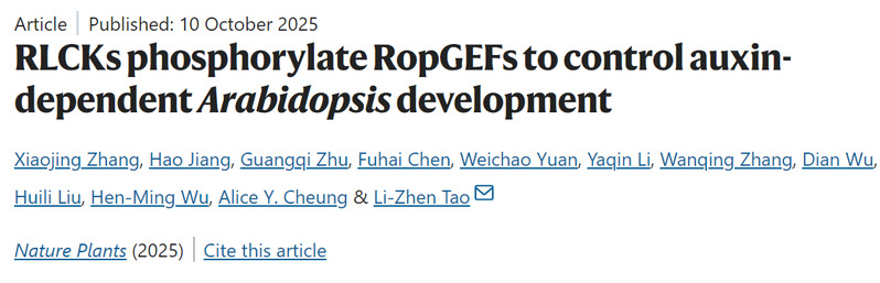 近日,生命科学学院陶利珍团队在Nature Plants杂志在线发表题为RLCKs phosphorylate RopGEFs to control auxin-dependent Arabidopsis development的研究论文,揭示了胞质类受体激酶RAKs通过磷酸化精准调控RopGEF1的活性和稳定性,进而激活ROP分子开关和控制生长素依赖的发育机制。RLCK-RopGEF功能模块的鉴定,填补了生长素与ROP之间的细胞表面信号通路中缺失的关键节点。