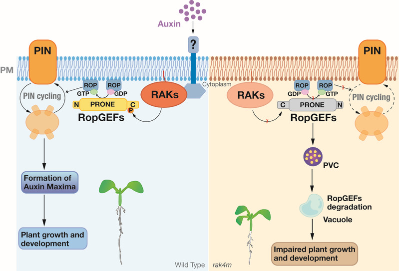 该研究发现,生长素能够促使RopGEF1蛋白发生磷酸化, 这一过程需要胞质类受体蛋白激酶RAKs(RopGEF Activating Kinases)的参与。生化分析表明,RAKs能够与RopGEF1相互作用并在其羧基端(C端)的关键磷酸化位点S488特异性磷酸化RopGEF1,将其招募至细胞膜,活化RopGEF1,增强对ROP6的催化活性。敲除这些RAKs,导致RopGEF1蛋白的降解。分子细胞生物学分析显示,rak4m四突根细胞中的RopGEF1发生内吞,并与液泡的标记蛋白共定位,最终可能在液泡中降解。 敲除这些RAKs,会阻碍生长素诱导的RopGEF1的磷酸化,从而抑制ROP6的活化。表达模拟磷酸化状态的突变型RopGEF1 (S488D)能够完全回补rak4m四突的生长发育缺陷的表型。这些结果证明了:RAKs对RopGEF的磷酸化修饰是激活ROP信号途径、调控下游生长发育的核心信号元件。