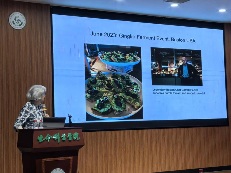随后,教授又介绍了颜值与营养并存的紫色番茄。她提到,团队把金鱼草里的DelRos1两个基因导入番茄,让番茄积累了大量花青素从里到外变成了紫色。这种紫色番茄的花青素含量最高能到2.83mg/g鲜重,和蓝莓、黑莓差不多,而且亲水抗氧化能力比普通番茄翻了3倍。用这种番茄喂实验小鼠,能显著延长小鼠的寿命,充分体现了它的健康价值。