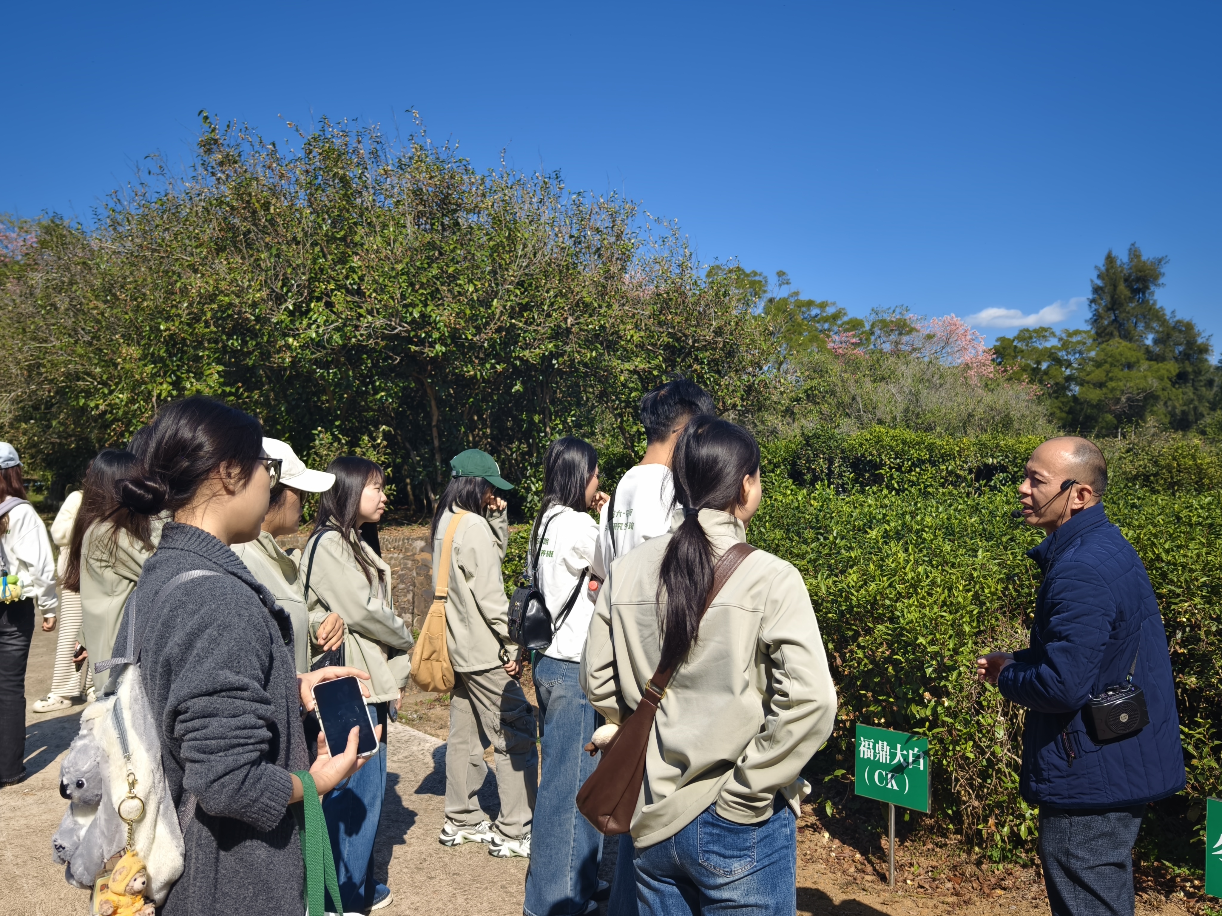 抵达基地后,在负责人的带领下,师生们了解了茶叶所的发展历程与英德基地的建设情况,并参与了茶文化品鉴活动,对广东茶产业的历史与现状有了初步认识。随后,大家集体参观了广东省茶树种质资源圃。面对数百份珍贵的茶树种质资源,负责人从生物多样性保护到种业科技创新等方面进行了详细讲解。同学们不仅了解到每一株茶树背后的科研故事,也深刻认识到种质资源作为国家农业战略安全基石的重要性。