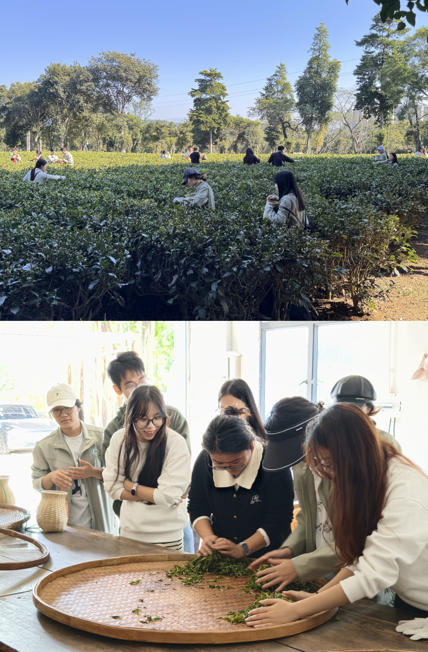 午后,活动进入沉浸式劳动教育环节。在技术人员的示范和指导下,同学们分组深入茶垄,亲手采摘茶叶嫩芽,体验从采摘、萎凋、揉捻到干燥的传统绿茶制作工艺。指尖触碰青叶,掌心感受温度,在亲身体验中,同学们真切体会到茶叶生产的艰辛与匠心,对“一粥一饭,当思来之不易”有了更为具体而深刻的理解。