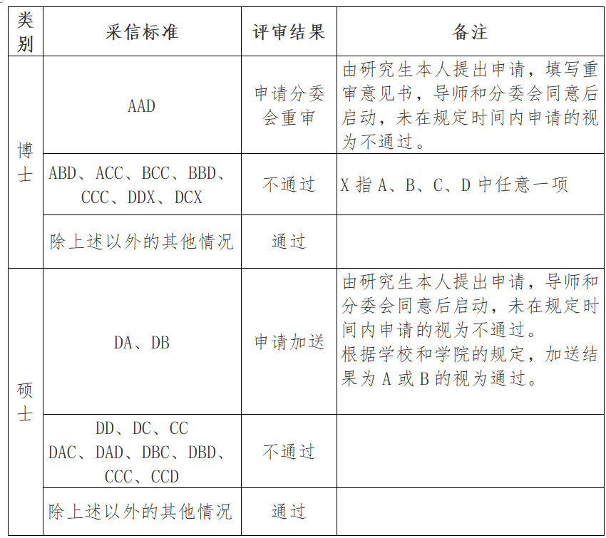 其中博士学位论文匿名评审结果为“AAD”的,经研究生本人申请、导师和学院分委会同意,可申请分委会重审;硕士学位论文匿名评审结果为“DA”“DB”的,经研究生本人申请、导师和学院分委会同意,可申请继续加送1份,不得修改论文,不得继续送审原评审专家。