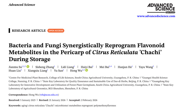 2026年2月9日,华南农业大学药用植物研究中心吴鸿教授团队在《Advanced Science》(中科院一区Top期刊,影响因子14.1)在线发表题为“Bacteria and Fungi Synergistically Reprogram Flavonoid Metabolites in the Pericarp of Citrus Reticulata‘Chachi’During Storage”的研究论文。该研究通过微生物组、代谢组大数据分析,并结合微生物发酵和酵母表达体系验证,揭示了“真菌(Aspergillus)- 细菌(Bacillus)”跨界协同作用通过两步酶促反应将川陈皮素(Nobiletin)转化为橘皮素(Tangeretin)的分子机理,为陈皮“陈久者良”的科学内涵提供了微生态学解释,并为中药材陈化过程的定向调控提供了新策略。
