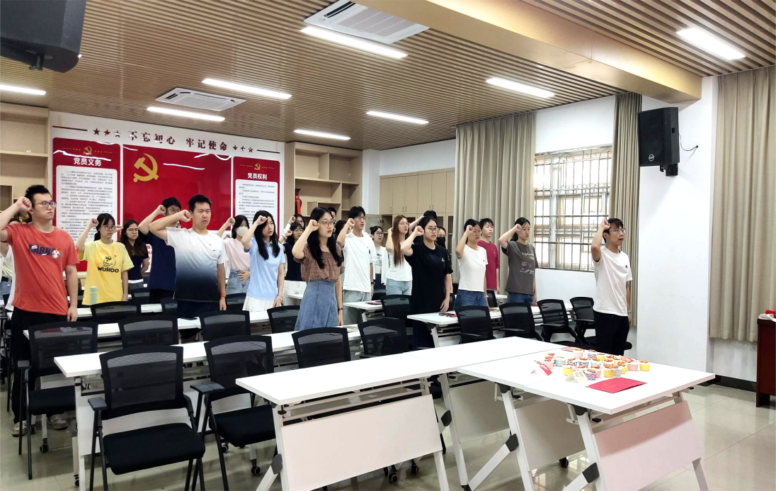 全体参会人员面对党旗庄严举起右手,新入党同志进行入党宣誓,支部其他同志一起重温入党誓词,领悟入党初心。